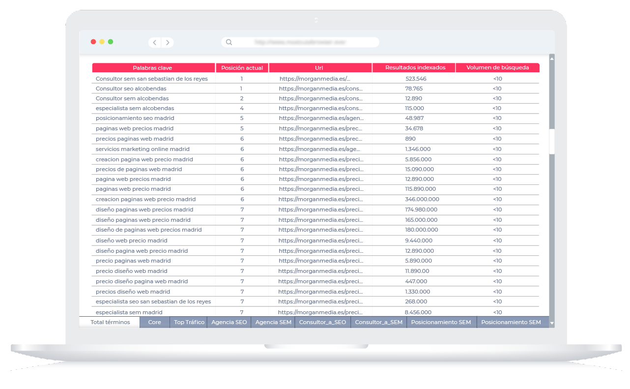 Analizamos los términos clave por los que se posiciona el dominio que quieres trabajar, incluyendo todas las palabras clave orgánicas relacionadas con los productos o servicios que comercializa tu empresa, la distribución en el Top 20 de las listas de resultados de Google, el CPC aproximado de todas las palabras, el número de resultados, el volumen de búsquedas y la URL en la que se localizan esos términos.
